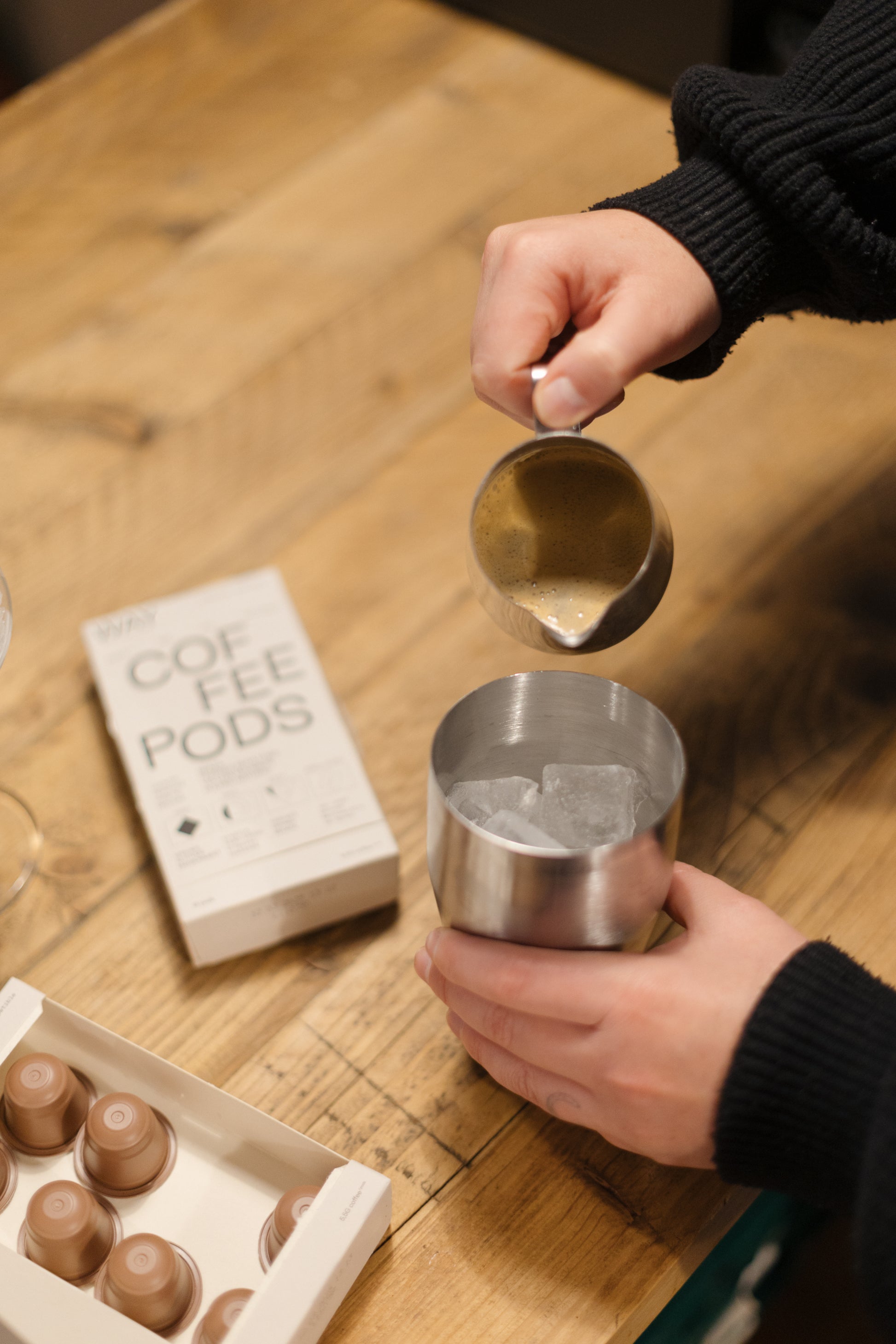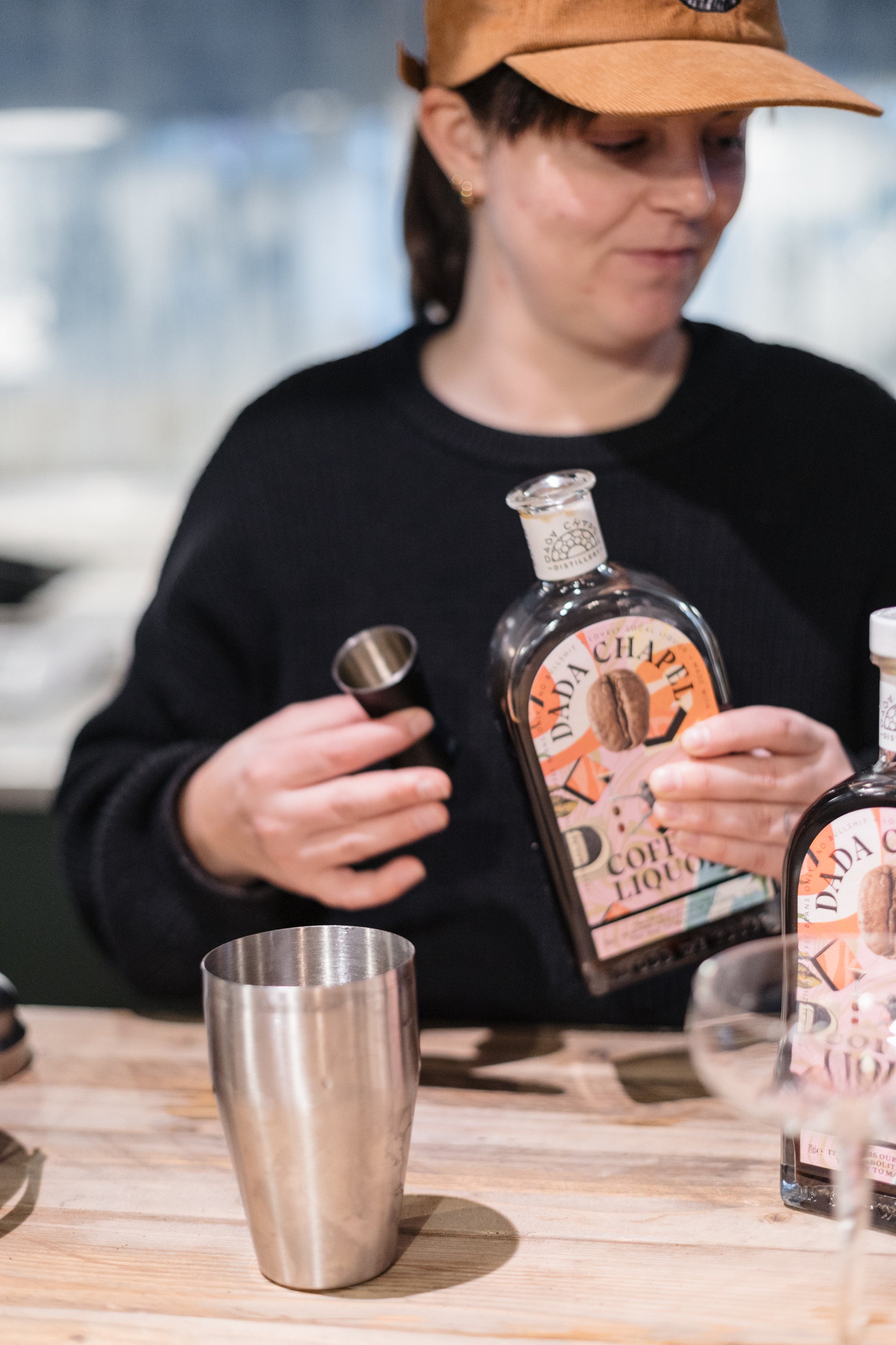 - Voeg de afgekoelde espresso, Dada Chapel Koffielikeur, wodka en eventueel de suikersiroop toe aan de shaker.