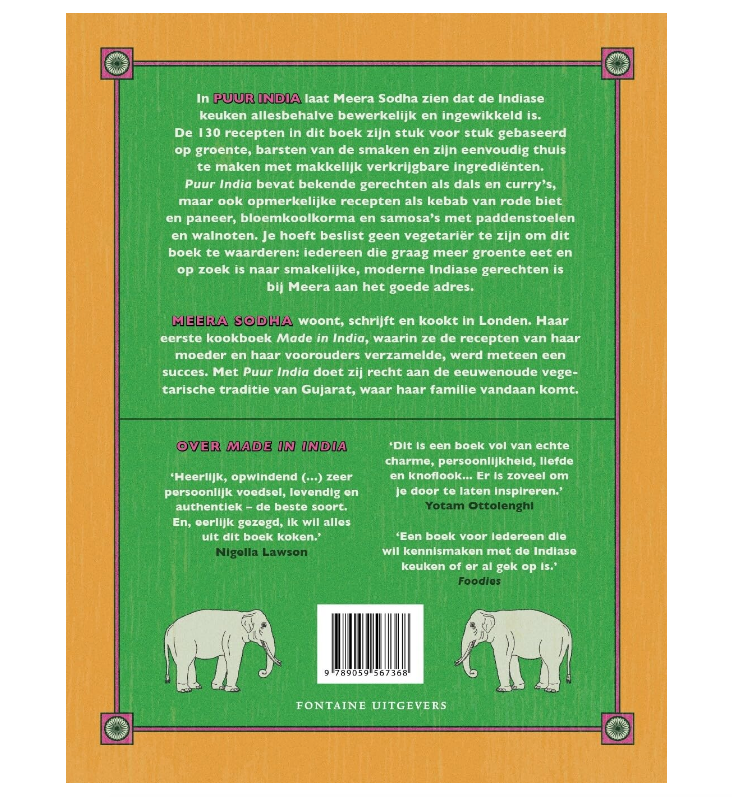 Puur India bevat bekende gerechten als dals en curry's, maar ook opmerkelijke recepten als kebab van rode biet en paneer, bloemkoolkorma en samosa's met paddenstoelen en walnoten. Je hoeft beslist geen vegetariër te zijn om dit boek te waarderen: iedereen die graag meer groente eet en op zoek is naar smakelijke, moderne Indiase gerechten is bij Meera aan het goede adres.