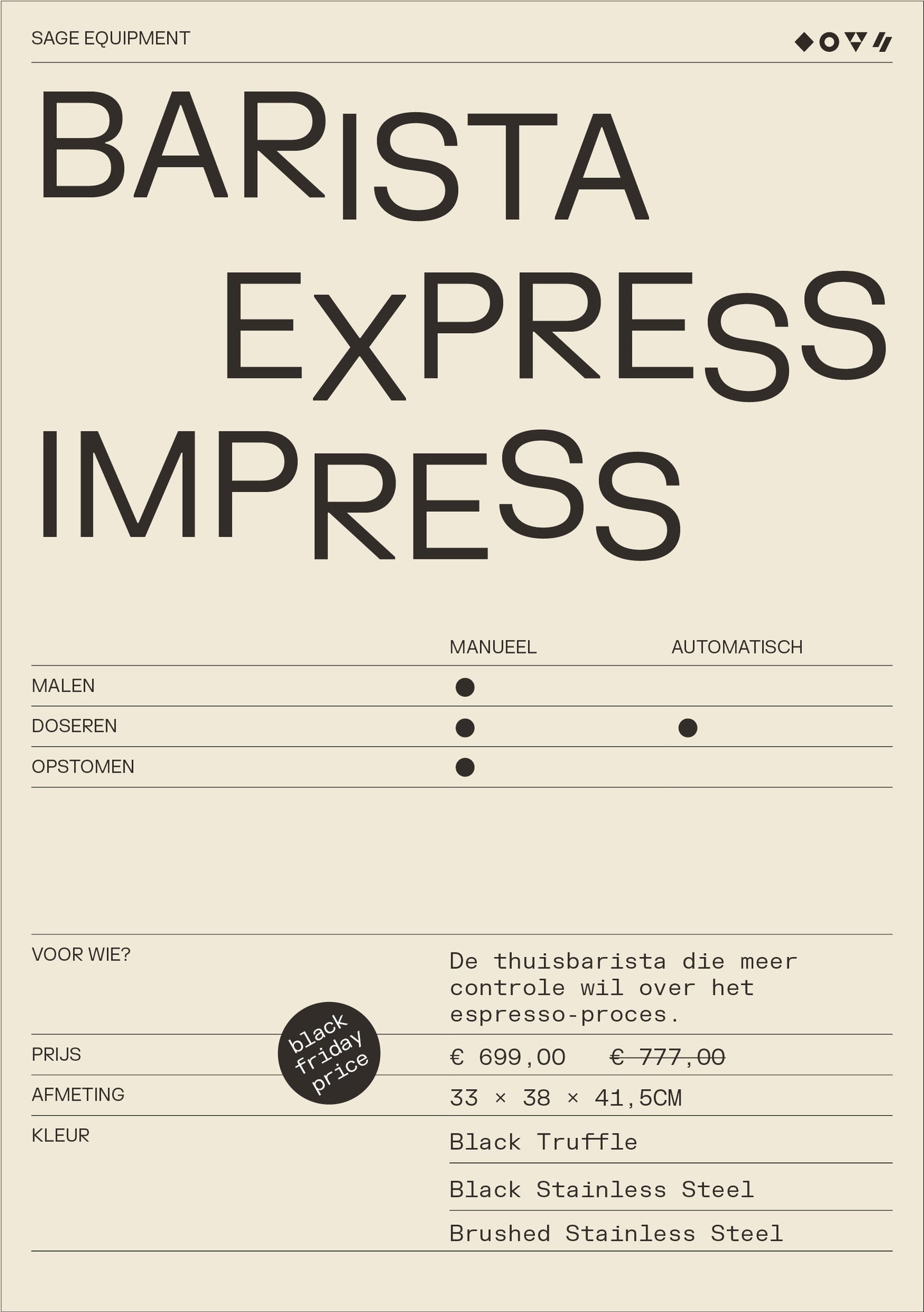De Sage Barista Express Impress volgt de 4-stappenformule van professionele espressomachines. Een exacte dosering van versgemalen koffie, nauwkeurige temperatuurregeling, 9 bar waterdruk en stoom om perfect microschuim mee te maken dat je kan gebruiken voor latte art.